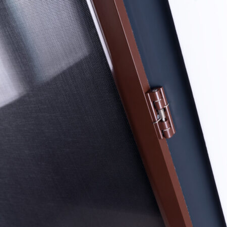 Moskitiera drzwiowa mocowana jest do ramy drzwi za pomocą trzech zawiasów oraz dwóch zamków magnetycznych (umieszczonych po przeciwległej stronie).
