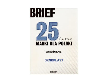 Wyróżnienie przyznane przez magazyn „Brief”, który umieścił firmę OKNOPLAST wśród 25 polskich firm o największym potencjale do budowania silnej marki POLSKA.