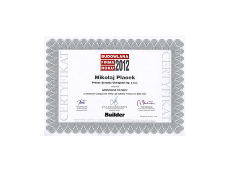 Wyróżnienie specjalne przyznane przez magazyn Builder za skuteczne zarządzanie firmą i sukcesy rynkowe w 2012.