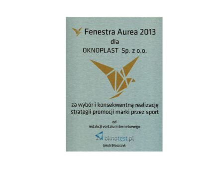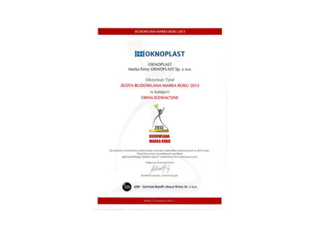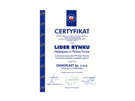 Tytuł Lider Rynku 2013 w kategorii „Najlepsza w Polsce Firma” w zakresie produkcji okien PVC klasa Premium – Nowoczesne produkty i rozwiązania pasywne.