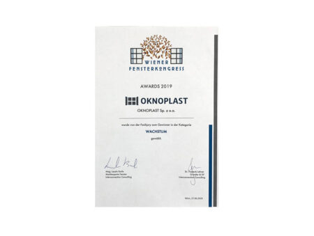 Nagroda otrzymana w ramach pierwszego Wiedeńskiego Kongresu Okien 2019 za regularny, dwucyfrowy wzrost na głównych rynkach funkcjonowania.