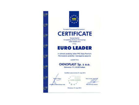 Certyfikat EURO LEADER 2014 przyznany został przez Kapitułę Europejskiego Konkursu Promocyjnego. Wyróżnienie umacnia pozycję przedsiębiorstwa w czołówce europejskich producentów.