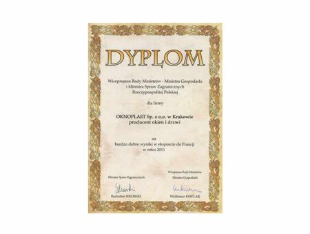 W siedzibie Ambasady RP w Paryżu w kategorii Największy Eksporter do Francji nagrodzona została Grupa OKNOPLAST. Prestiżowa inicjatywa została objęta patronatem Ministra Spraw Zagranicznych oraz Wicepremiera, Ministra Rozwoju, Pracy i Technologii. Celem konkursu było wyróżnienie liderów polskiego eksportu do Francji, a także zwrócenie uwagi francuskich środowisk gospodarczych na wysoką jakość i konkurencyjność polskiej oferty.