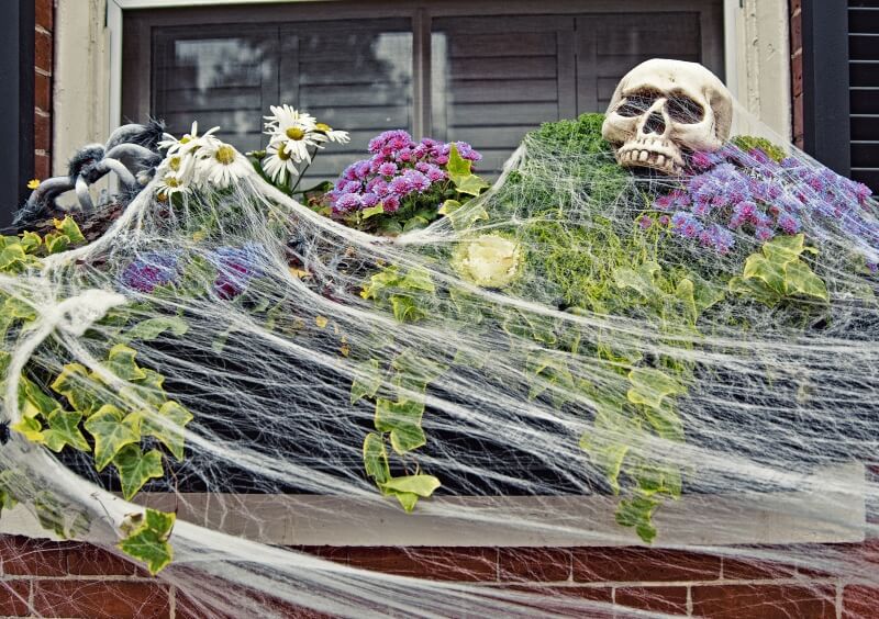 Jeśli planujesz imprezę halloweenową lub przy Twojej ulicy w Halloween wędrują przebrane dzieci, zdecyduj się na ekspresową, ale efektową dekorację halloweenową okna. Wystarczy sztuczna pajęczyna w sprayu i czaszka z tworzywa sztucznego, którą umieścić możesz w donicy z kwiatami lub bezpośrednio na parapecie. Całość obficie spryskaj pajęczyną i… gotowe! Taka dekoracja okna na Halloween z pewnością wzbudzi dreszczyk grozy i emocji.