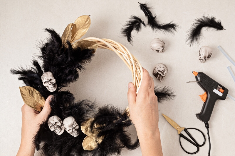 Nie masz czasu na organizowanie kwiatów? Wyjdź do parku czy ogrodu i nazbieraj kolorowych, zaschniętych liści. Możesz z nich stworzyć piękną dekorację na Halloween, jeśli połączysz ją z takimi elementami jak wykonane np. z papieru pająki i nietoperze czy też sztuczne pajęczyny.
