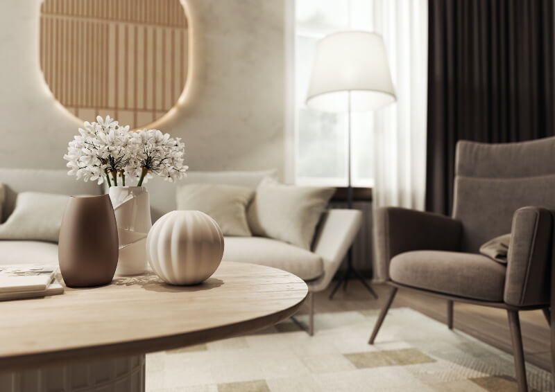 Ten kierunek chętnie stosowany jest w projektach stawiających na luksusowy spokój. Oznacza rezygnację z mocnych, czasami wręcz agresywnych kontrastów (np. czerń i biel, zieleń i fiolet) na rzecz budowania barwne warstwy pomieszczenia poprzez używanie odcieni jednego koloru w różnych tonacjach. Efekt? Poczucie głębi, spokoju i harmonii. Jak wygląda to w praktyce? Wyobraź sobie, że używasz tej samej barwy, ale w wersji jaśniejszej, ciemniejszej i pośredniej – jakbyś rozwadniał farbę wodą, uzyskując subtelne, płynne przejścia bez ostrych granic kolorów. Efekt wizualny jest wyjątkowo spójny i relaksujący dla oka. Może też być modny, o ile wybierzesz różne odcienie najmodniejszych w 2026 roku barw, np. różne odcienie beżu, błękitu czy zieleni.
