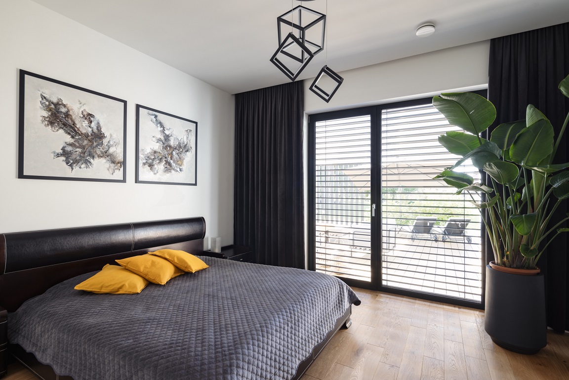 W domach parterowych, jak już zostało wspomniane, sypialnie ulokowane są na poziomie zerowym. Chociaż zazwyczaj projektanci starają się je umieszczać w części domu skierowanej na ogród, nie zawsze jest to możliwe. Zwłaszcza na działkach narożnych istnieje spore ryzyko, że sypialniane okna w domu parterowym skierowane będą na ruchliwą ulicę czy uczęszczany chodnik. W takim przypadku, aby efektownie wypoczywać nocą, niezwykle ważne jest zadbanie o odpowiednią akustykę wnętrza. Hałasy z zewnątrz dobrze wyciszą m.in. okna do domu parterowego o grubych pakietach szybowych. Co ciekawe, wpływ na właściwości akustyczne okien ma także kształt szyb – lepiej wyciszają te prostokątne. Dodatkową ochronę przed hałasem dają szyby laminowane folią akustyczną.