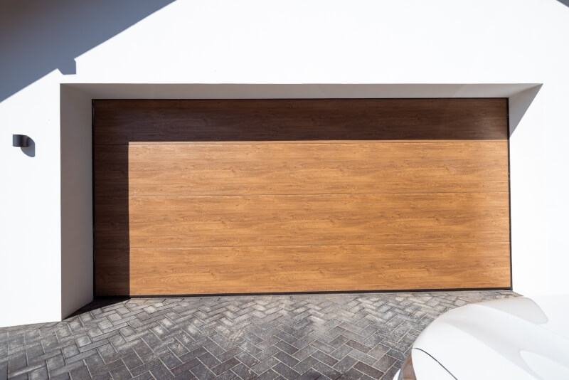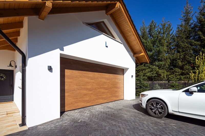 Wejściowe drzwi z drewnianymi akcentami idealnie komponują się z estetyką zewnętrzną, oferując zarówno styl, jak i bezpieczeństwo. Z kolei brama garażowa z drewnianym wykończeniem łączy nowoczesną technologię z tradycyjnymi materiałami, co stanowi o niepowtarzalnym charakterze