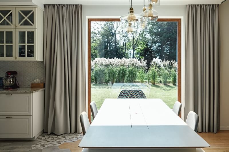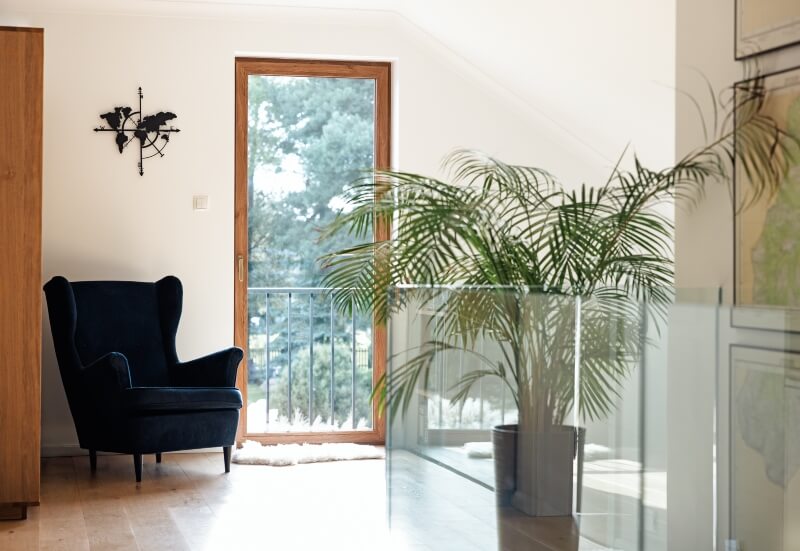 Duża powierzchnia szyb przepuszcza bardzo dużo naturalnego światła do wnętrz – to kluczowe dla przestrzeni o otwartym planie – a takie właśnie zastosowano w projekcie domu. W systemie PIXEL warto zwrócić też uwagę na możliwość wyboru wąskiego słupka ruchomego z centralnie umieszczoną klamką, który dodaje oknom bardziej nowoczesnego charakteru.
