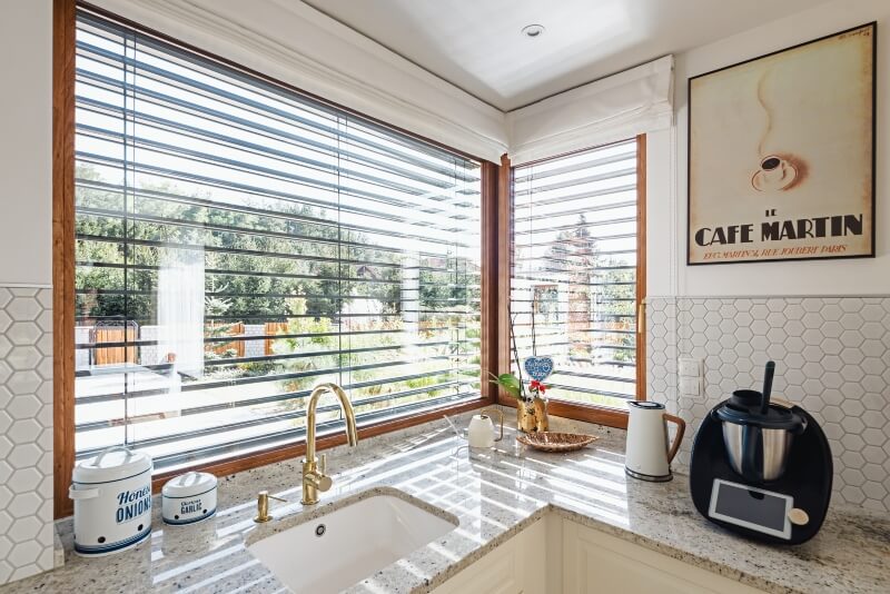 Ostatnim elementem, który zasługuje na szczególną uwagę w tym projekcie, są nowoczesne żaluzje fasadowe NODIO. Wyglądają niezwykle nowocześnie i estetycznie, a także podkreślają wyjątkowy charakter wnętrz. Dzięki solidnej konstrukcji i możliwości regulacji kąta nachylenia lameli, żaluzje NODIO skutecznie chronią wnętrze przed nadmiernym nasłonecznieniem, jednocześnie umożliwiając kontrolę nad ilością dostarczanego światła.