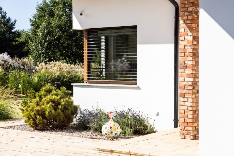Kluczową rolę w wyglądzie i funkcjonalności domu odgrywają okna. Duże, panoramiczne okna od podłogi aż po sufit nie tylko wpuszczają do wnętrza obfitość światła naturalnego, ale również tworzą płynne przejście między przestrzenią wewnętrzną a zewnętrzną, umożliwiając mieszkańcom korzystanie z widoku na otaczający dom zadbany ogród.
