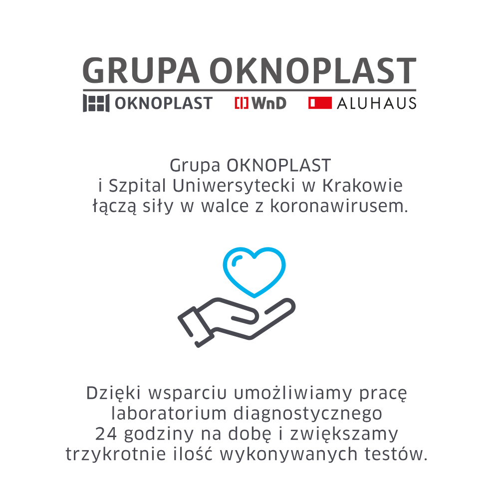 Trwa światowa walka z epidemią koronawirusa. W pomoc najbliższej społeczności włączyła się również Grupa OKNOPLAST, która rozpoczęła współpracę ze Szpitalem Uniwersyteckim w Krakowie. Szpital, w celu odpowiedniej diagnostyki COVID-19, utworzył Pracownię Immunodiagnostyki i Diagnostyki Molekularnej Zakładu Mikrobiologii, w której przez 8 godzin dziennie były sprawdzane kolejne próbki. Grupa OKNOPLAST przekazała środki dzięki którym ta pracownia będzie działała przez całą dobą, a co za tym idzie możliwość wykonywania testów wzrosła trzykrotnie. Tylko dzięki szybkiej diagnostyce medycy mogą wdrożyć odpowiednie leczenie, a także zastosować należyte środki bezpieczeństwa.