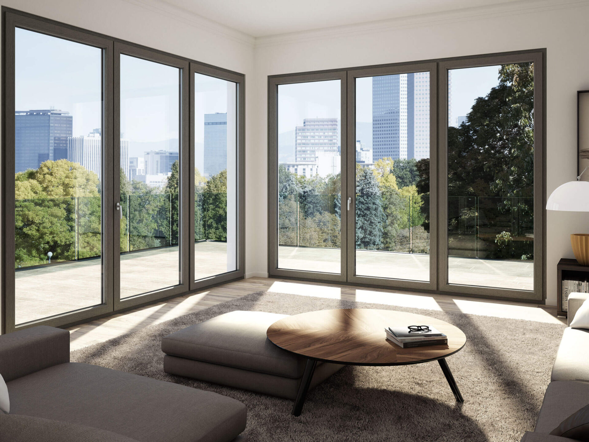 Nowoczesny salon z dużymi oknami i drzwiami balkonowymi WINERGETIC PREMIUM w kolorze dąb bagienny, które nadają wnętrzu elegancji i naturalnego charakteru. Ciepły odcień ram okiennych doskonale współgra z jasnymi ścianami, tworząc harmonijną i przytulną atmosferę. Niewidoczne okucia WINKHAUS ACTIVPILOT SELECT zapewniają estetyczny wygląd bez widocznych elementów montażowych, podkreślając minimalistyczny design. Srebrne klamki dESIGN+ dodają nowoczesnego akcentu, idealnie komponując się z resztą wystroju. Duże przeszklenia gwarantują maksymalne doświetlenie wnętrza naturalnym światłem, tworząc przestronną i komfortową przestrzeń do życia.