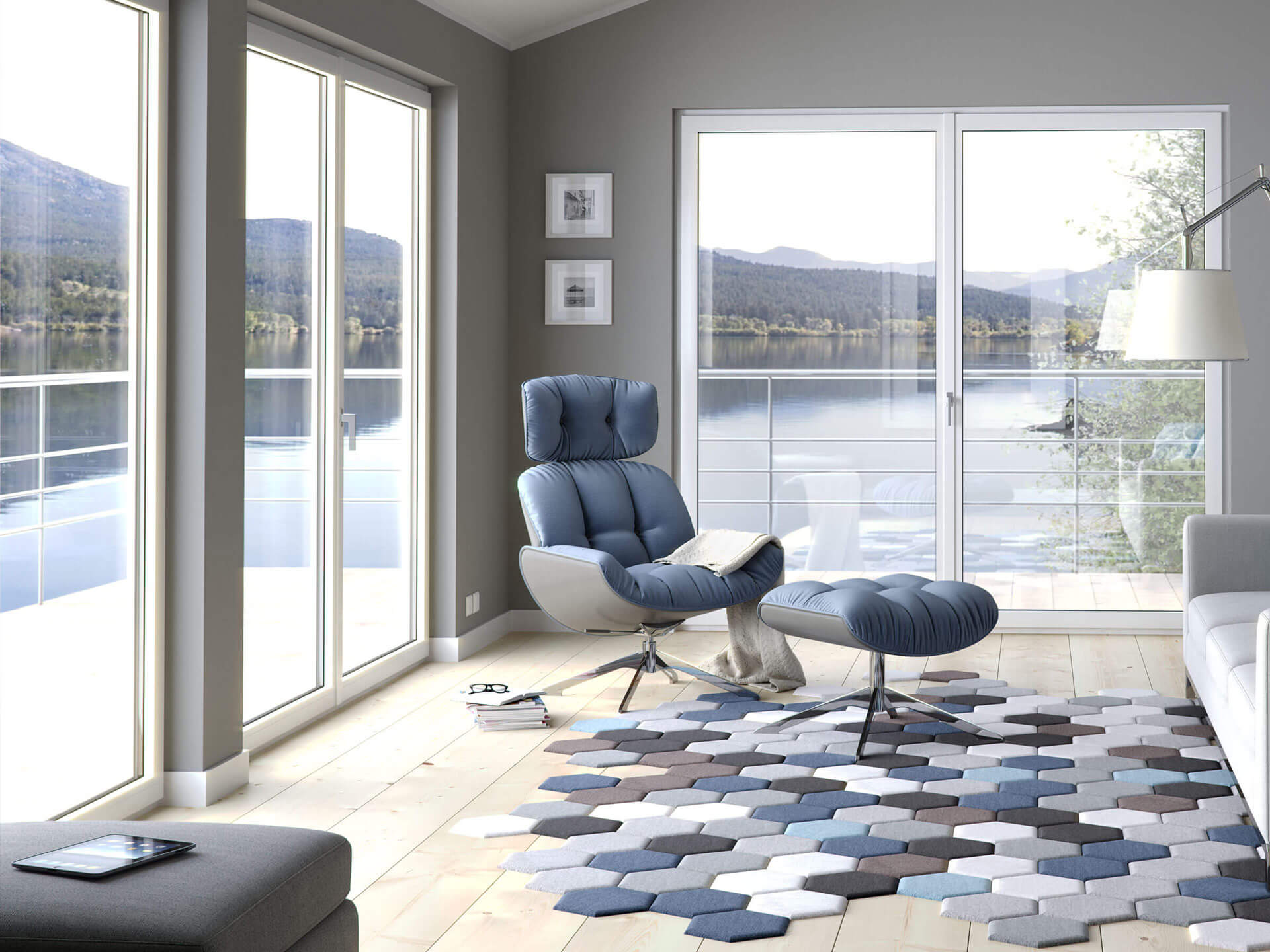 Przestronny salon w nowoczesnym stylu, wyposażony w okna PIXEL w kolorze białym. Okna te doskonale harmonizują z jasnym wnętrzem, dodając mu elegancji i świeżości. Niewidoczne okucia WINKHAUS ACTIVPILOT SELECT zapewniają estetyczny wygląd i niezawodność użytkowania, a srebrna klamka PIXEL f1 wprowadza subtelny akcent wykończeniowy. Duże przeszklenia wpuszczają do pomieszczenia mnóstwo naturalnego światła, co tworzy przyjemną i relaksującą atmosferę. System PIXEL, z doskonałymi parametrami izolacji termicznej i akustycznej, stanowi funkcjonalne i stylowe rozwiązanie dla nowoczesnych przestrzeni mieszkalnych.