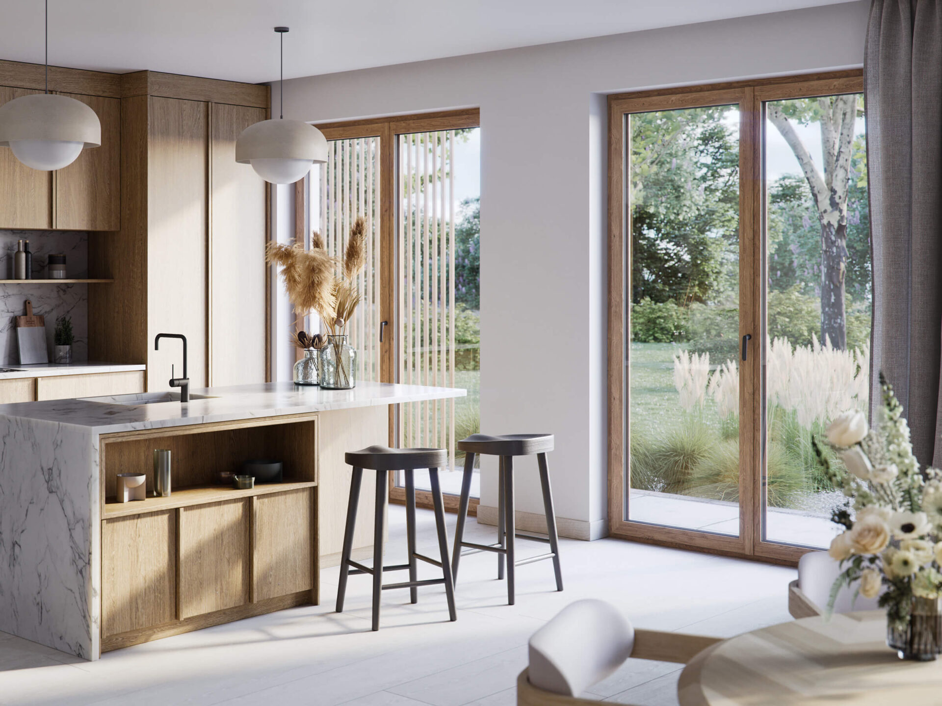 W jasnej kuchni inspirowanej stylem naturalnym zastosowano system okien balkonowych PRISMATIC w dekorze Woodec Turner Oak Malt, który harmonijnie koresponduje z wykończeniem mebli. Wąskie profile, smukły słupek z centralną klamką oraz większe przeszklenia podkreślają lekkość wnętrza i zapewniają optymalne doświetlenie. System oferuje wysoką izolacyjność termiczną oraz akustyczną, co przekłada się na komfort użytkowania przez cały rok.