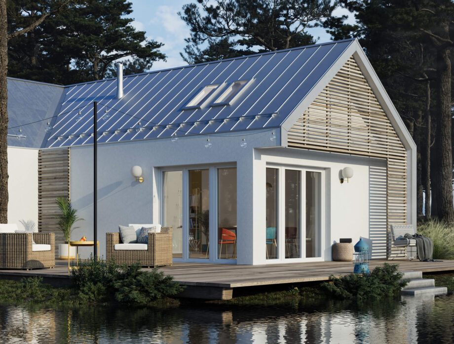 Jasny, przestronny salon z dużymi białymi oknami PIXEL wychodzącymi na zielony, leśny krajobraz. Głównym elementem jest duży, szary narożnik z miękkimi poduszkami, który zapewnia obfitość siedzeń. Obok sofy umieszczony jest mały, okrągły stolik kawowy na drewnianych nogach z jasnego drewna, na którym stoi szklany słoik z zieloną roślinnością.