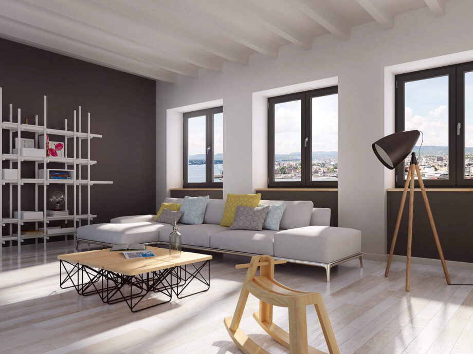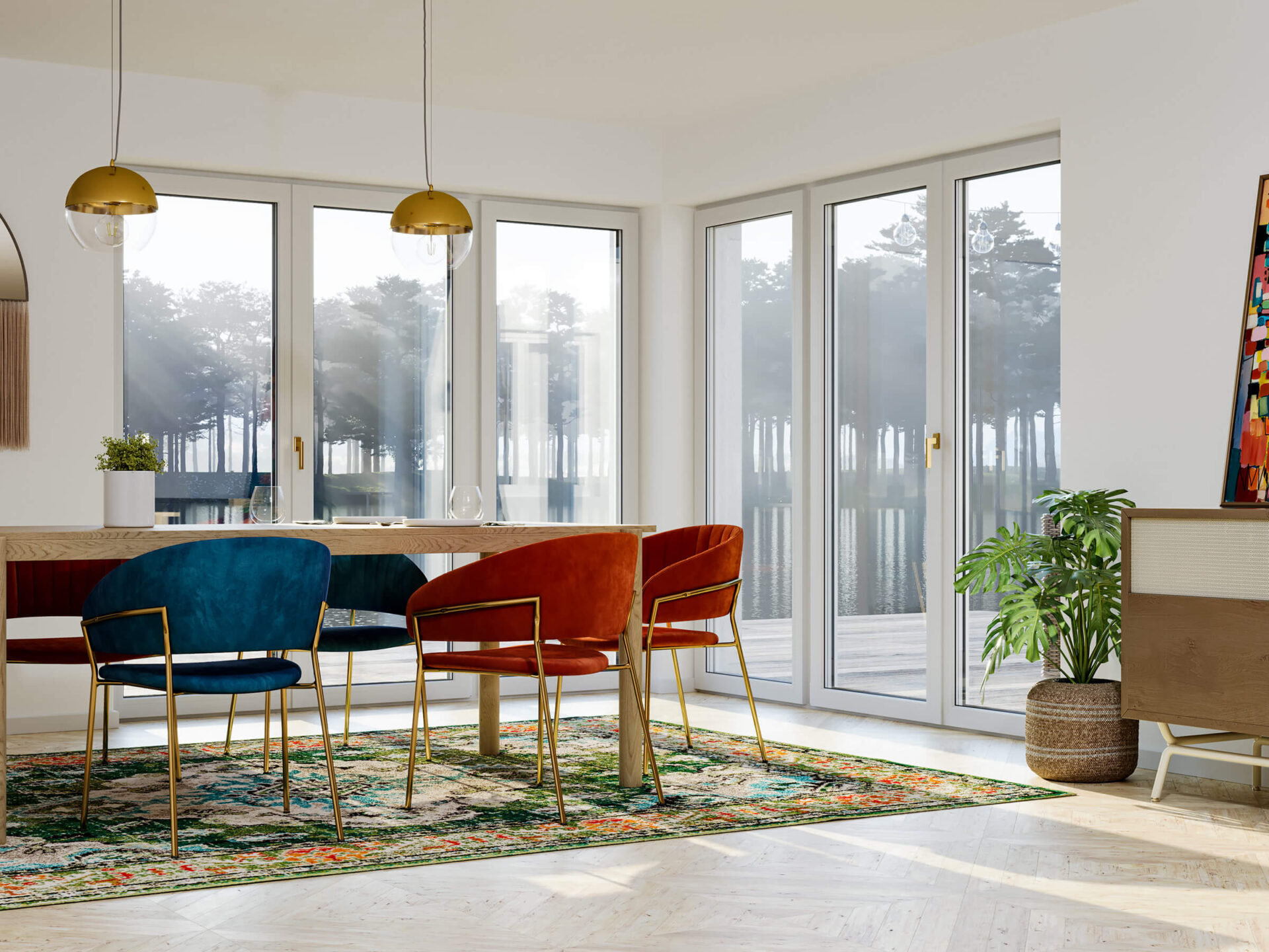 W nowoczesnym salonie z jadalnią zastosowano balkonowe okna PRISMATIC w kolorze białym z centralnie umieszczoną klamką, które subtelnie wpisują się w minimalistyczny charakter wnętrza. Smukły profil skrzydła i duże przeszklenia pozwalają maksymalnie wykorzystać naturalne światło, a współczynnik przenikania ciepła gwarantuje efektywną izolację termiczną.
