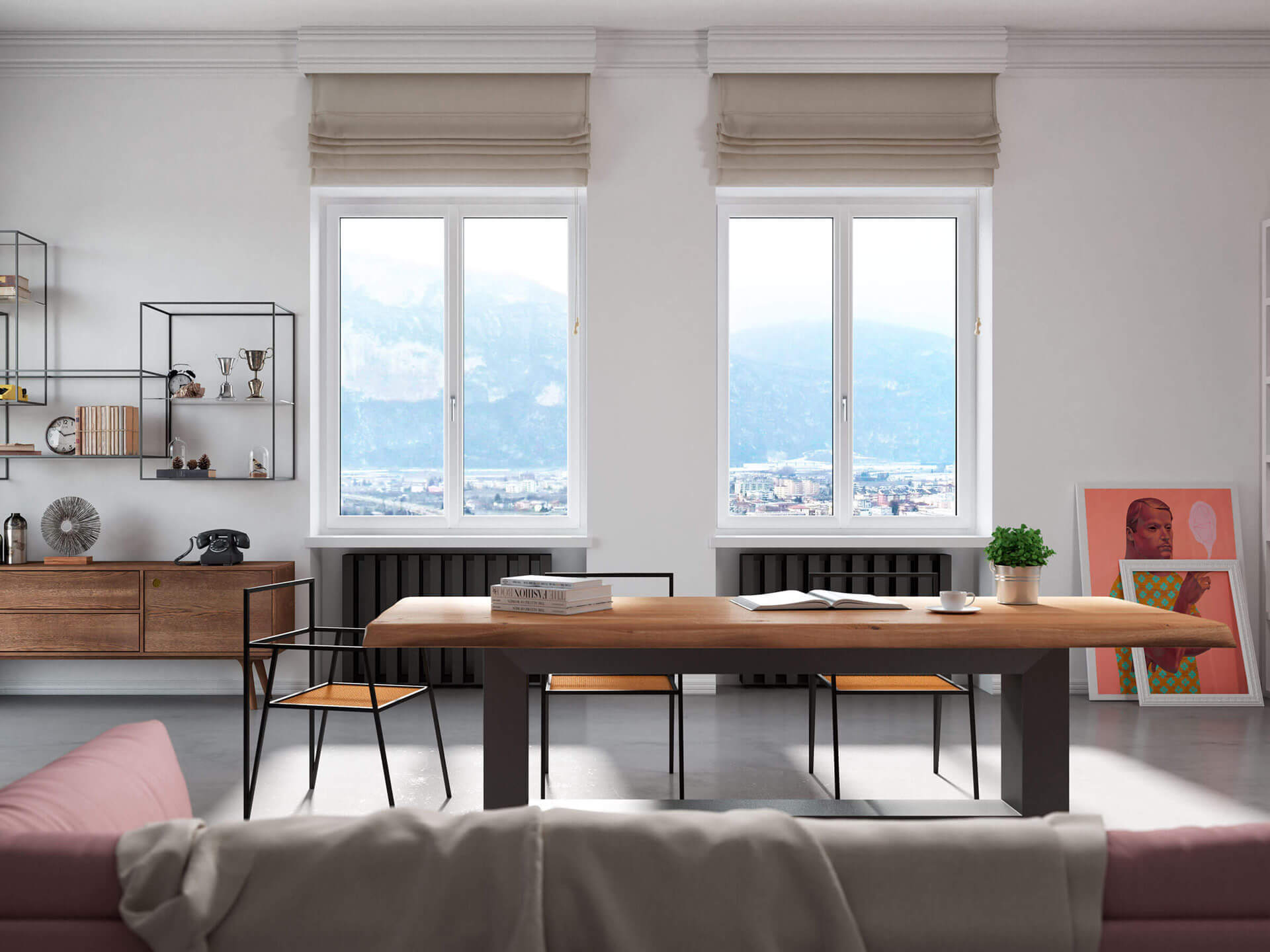 Stylowa jadalnia wyposażona w okna PIXEL w kolorze białym, które doskonale komponują się z jasnym, nowoczesnym wystrojem wnętrza. Okna PIXEL cechują się geometrycznym, minimalistycznym designem oraz zastosowaniem niewidocznych okuć WINKHAUS ACTIVPILOT SELECT, co podkreśla ich elegancki wygląd. Srebrne klamki PIXEL (kolor F1) dodają subtelnego blasku, harmonizując z białymi ramami okien. Duże powierzchnie przeszkleń zapewniają doskonałe doświetlenie pomieszczenia, a wysokie parametry izolacyjne gwarantują komfort termiczny przez cały rok.