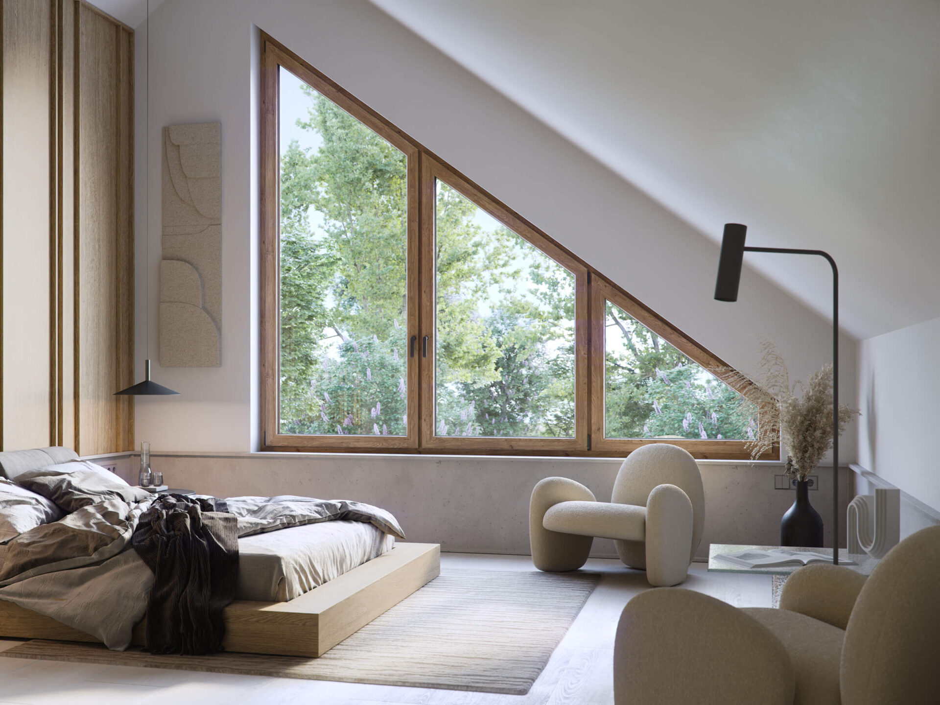 Nowoczesna sypialnia na poddaszu zyskała wyrazisty charakter dzięki zastosowaniu trapezowych okien PRISMATIC w okleinie Woodec Turner Oak Malt. Nietypowy kształt konstrukcji oraz klamka SLEEK w kolorze czarnym podkreślają geometryczną spójność projektu. System PRISMATIC oferuje wysoką izolacyjność, a większa powierzchnia szyb zapewnia naturalne doświetlenie i wrażenie przestronności.