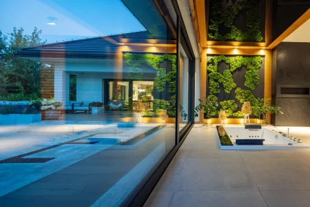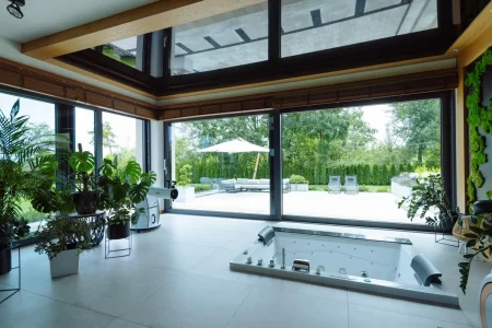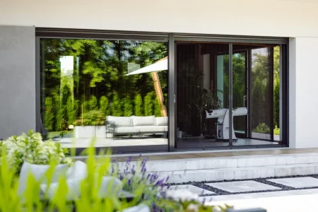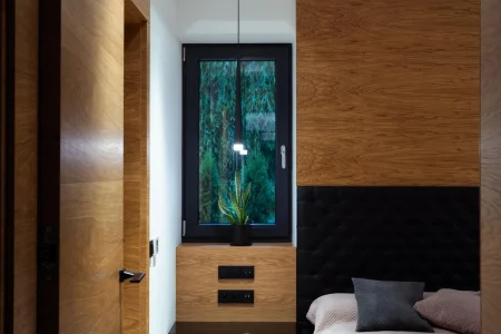 Wybór systemu Winergetic Premium świadczy o dążeniu do najwyższych parametrów izolacji cieplnej i estetyki. Okna te komponują się z bryłą budynku, nadając mu elegancki, nowoczesny charakter – bez zbędnych ozdobników. Drzwi tarasowe typu PSK i PSK-Z zapewniają komfortowy dostęp na zewnątrz oraz zachowanie harmonii w projekcie fasady. Natomiast drzwi aluminiowe nadają wejściu dominujący, trwały charakter, który odpowiada standardowi całej realizacji.