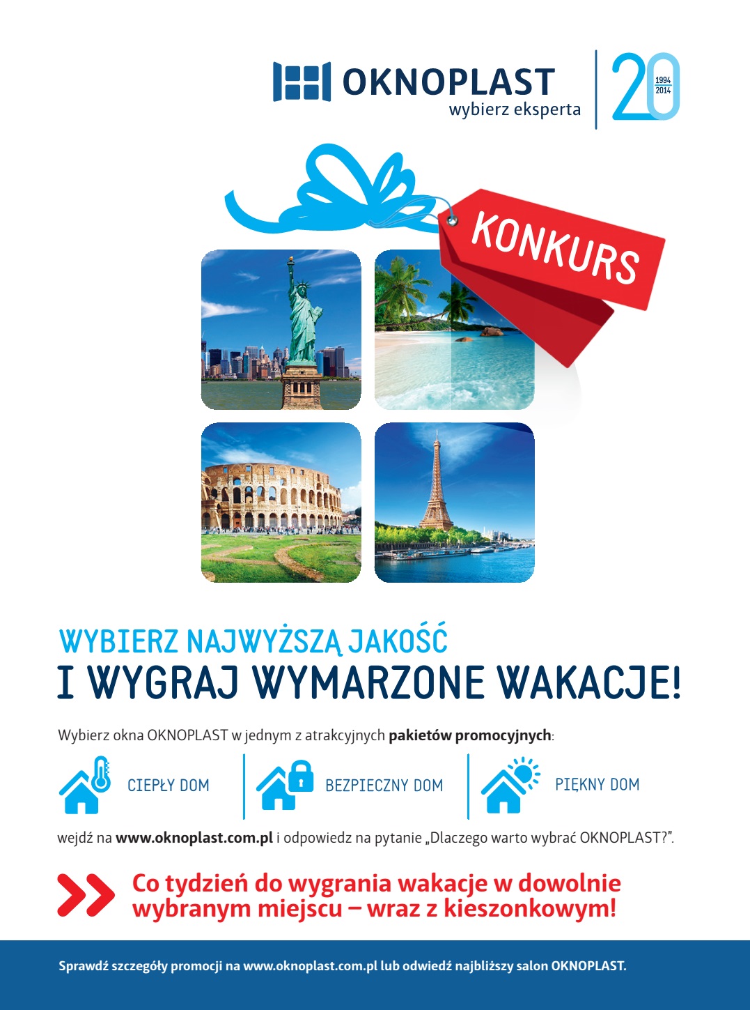 Startuje urodzinowa promocja OKNOPLAST. Jubileuszowa promocja OKNOPLAST to szansa na zakup okien na wyjątkowo atrakcyjnych warunkach. Promocja będzie trwać przez całe wakacje, czyli aż 3 miesiące, w trakcie których firma co tydzień rozdawać będzie vouchery na wczasy w dowolnie wybranym miejscu wraz z kieszonkowym.
