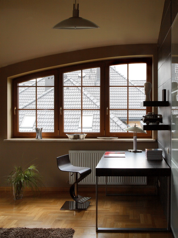 W celu odpowiedniego doświetlenia poddasza, powierzchnia okien powinna być równa od 1/6 do 1/8 powierzchni podłogi. W lukarnie, tam gdzie to możliwe, warto zaplanować główny otwór okienny o wysokości 120 cm. Nie bez znaczenia jest też poziom, na jakim umieścimy okna – najkorzystniejsze oświetlenie uzyskamy montując je 85-100 cm nad podłogą. Ponieważ okno znajduje się we wnęce, najwięcej promieni słonecznych znajdzie się w jego pobliżu. Miejsca oddalone będą skąpane natomiast w przyjaznym cieniu. Warto wykorzystać taki układ. Pod oknem możemy ustawić stół do pracy, a pozostałą powierzchnię przeznaczyć na strefę relaksu, w której zatopimy się w miękkim fotelu.